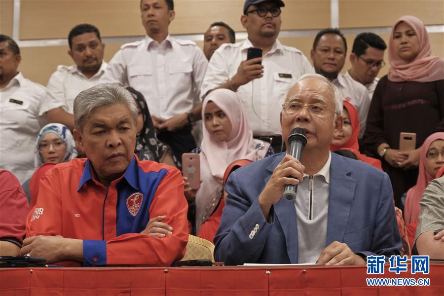 5月12日,在马来西亚吉隆坡,刚刚卸任的马来西亚前总理纳吉布(前中)出席新闻发布会。纳吉布当日宣布为大选结果承担责任,立即辞去马来民族统一机构(巫统)主席和原执政联盟国民阵线(国阵)主席职务。 新华社发