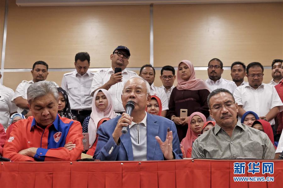 5月12日,在马来西亚吉隆坡,刚刚卸任的马来西亚前总理纳吉布(前中)出席新闻发布会。纳吉布当日宣布为大选结果承担责任,立即辞去马来民族统一机构(巫统)主席和原执政联盟国民阵线(国阵)主席职务。 新华社发