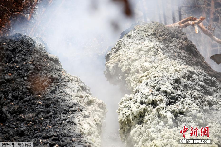 图为夏威夷帕霍阿镇附近的“莉拉妮地产”居民区内,地表因火山持续喷发出现裂缝,含有二氧化硫等有毒成分的气体从裂缝中不断冒出。