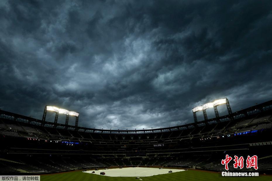 当地时间2018年5月15日,美国纽约突降暴雨。图为美国棒球职业大联盟纽约大都会对阵多伦多蓝鸟队的比赛中,天空瞬时乌云密布。