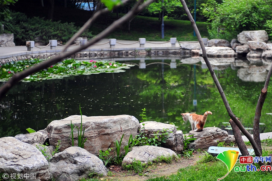 2018年5月15日,北京玉渊潭公园内被困树上的小猫成功获救。小猫口渴了,站在湖边准备喝水,但因为天性胆小,有些害怕不敢俯下头。