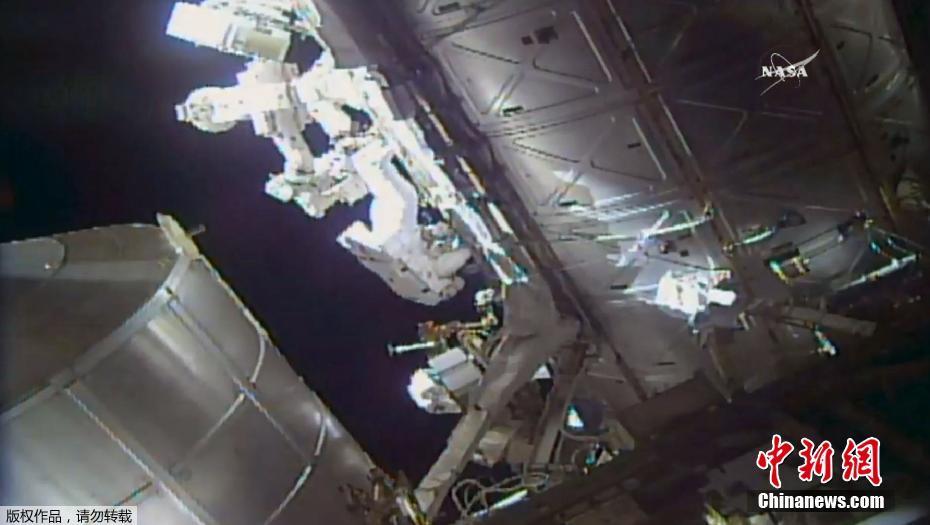 当地时间5月16日,国际空间站上两名宇航员出舱太空行走,更换检查两个外置冷却箱。(视频截图)