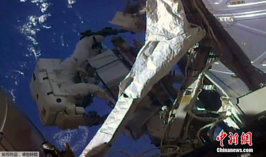 当地时间5月16日,国际空间站上两名宇航员出舱太空行走,更换检查两个外置冷却箱。(视频截图)