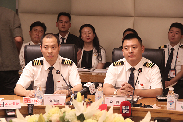 5月16日下午,机长刘传健(左)和机组成员与媒体见面。澎湃新闻记者 魏凡 图