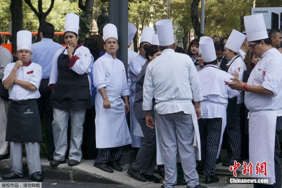 图为墨西哥城的一间酒店的厨师跑上街头避难。去年9月7日,墨西哥曾发生8.2级地震,造成96人死亡。