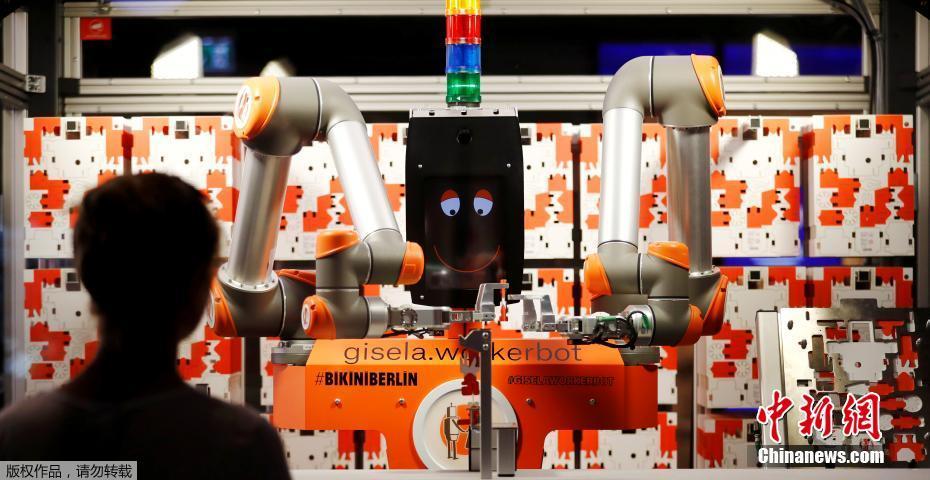 当地时间2018年5月16日,德国柏林,机器人售货员Gisela组装一个玩具机器人,然后把它卖掉。