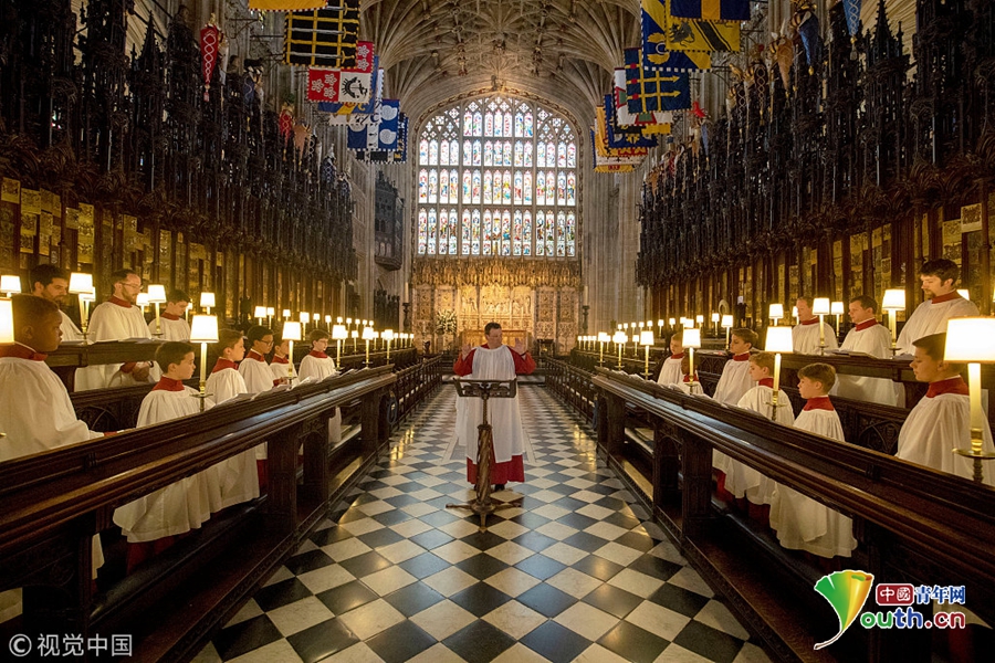 当地时间2018年5月14日,英国温莎,圣乔治教堂合唱团为哈里王子大婚进行彩排。哈里王子和梅根的婚礼仪式将在温莎城堡圣乔治教堂举行。