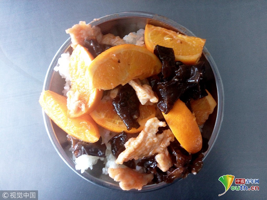 2016年3月17日,山东聊城,山东一高校食堂内推出水果神菜“橙子木耳炒肉”菜品,吸引了众多大学生排队购买,该菜品一经推出就以其清爽的口感和新奇的创意受到大家的一致好评。