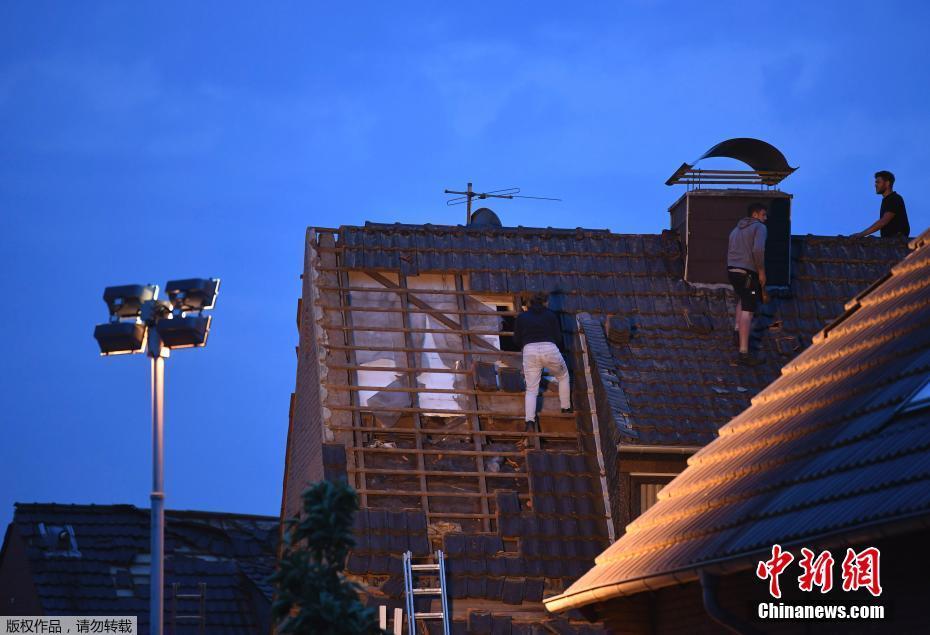 当地时间5月16日,德国西部莱茵河下游区域遭遇龙卷风袭击。图为德国博伊斯海姆地区民众对受损房屋进行修复。