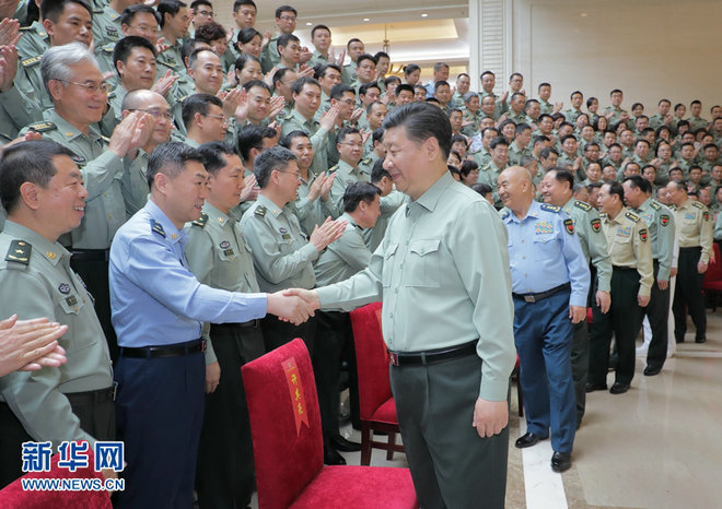 5月16日上午,中共中央总书记、国家主席、中央军委主席习近平视察军事科学院,代表党中央和中央军委,对军事科学院第八次党代表大会的召开表示热烈的祝贺,向军事科学院全体同志致以诚挚的问候。这是习近平亲切接见军事科学院第八次党代会代表。新华社记者李刚摄