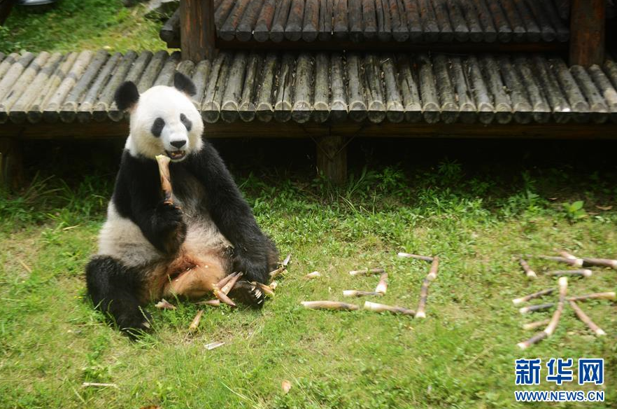 5月17日,在扬州市茱萸湾动物园,大熊猫“瑛美”在吃竹笋,动物园工作人员用竹笋拼成“回家 再见”字样,表达惜别祝福之意。当日,江苏省扬州市茱萸湾动物园为大熊猫“瑛美”举行送别仪式,“瑛美”将启程返回位于四川省都江堰市的中国大熊猫保护研究中心都江堰基地。“瑛美”是一只雌性大熊猫,2011年到扬州至今已在动物园生活了7年。新华社发(孟德龙 摄)