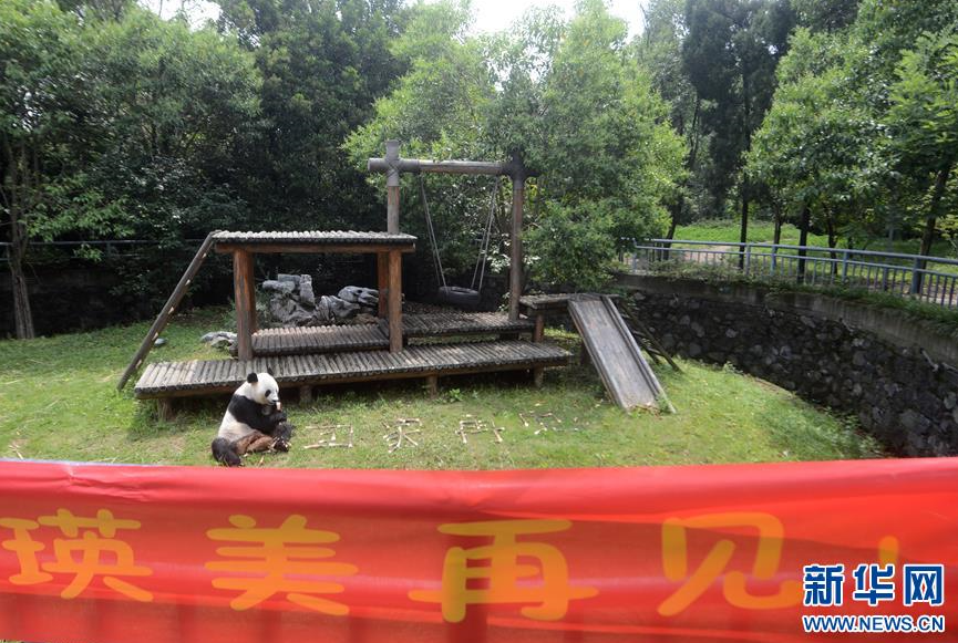 5月17日,在扬州市茱萸湾动物园,大熊猫“瑛美”在吃竹笋。当日,江苏省扬州市茱萸湾动物园为大熊猫“瑛美”举行送别仪式,“瑛美”将启程返回位于四川省都江堰市的中国大熊猫保护研究中心都江堰基地。“瑛美”是一只雌性大熊猫,2011年到扬州至今已在动物园生活了7年。新华社发(孟德龙 摄)