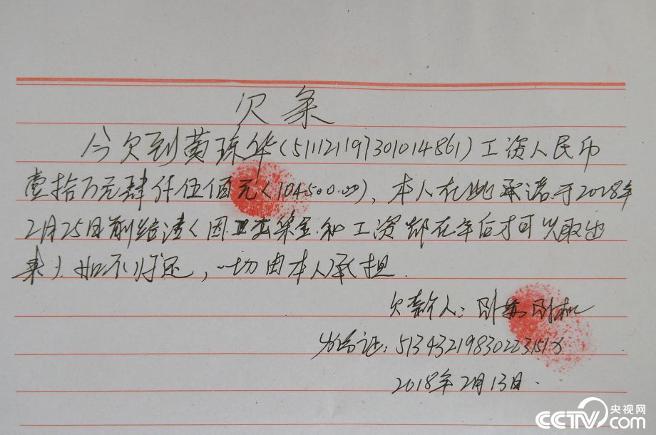 在当初签的合同中,记者看到,雇主苏先生允诺给黄大姐每月4500元的工资,家里的生活支出由苏先生负责。但在一年多以前,每月的这笔固定工资便都没有按时交付。“到现在为止欠了10万多了。”黄大姐随后出示了2018年2月13日的一张欠条,上面清楚地写明“本人(苏先生)承诺于2018年2月25日前缴清工资,104500元。”的诺言。“他(苏先生)说做生意亏了,欠我的钱之后一起还,我相信了他。”然而,一个多月过去了,拖欠的工资并未支付,连欠款人本人也联系不上了。黄大姐翻出了手机内和苏先生的微信聊天记录,两人最后的交流是5月6日,此后就再也没有收到过来自对方的任何信息,“打电话,通了也不接,孩子妈妈更不用说了。”黄大姐补充说,2018年正月初一,孩子母亲便收拾行李离开家里,具体原因不清楚,估计是因为夫妻矛盾,总之之后再也没有见过女方出现。同时,说他们是夫妻,这点也不能确认,“之前问过他们结婚证在哪里,他们说没有。”黄大姐回忆。