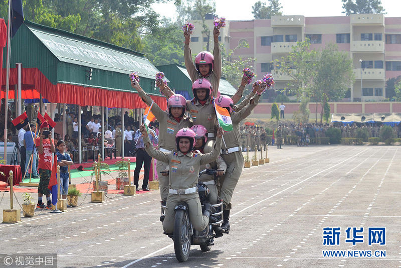5月19日,印度卢迪亚纳,在Kharkan训练营,印度边防部队女警察展示摩托车特技。(图片来源:视觉中国)
