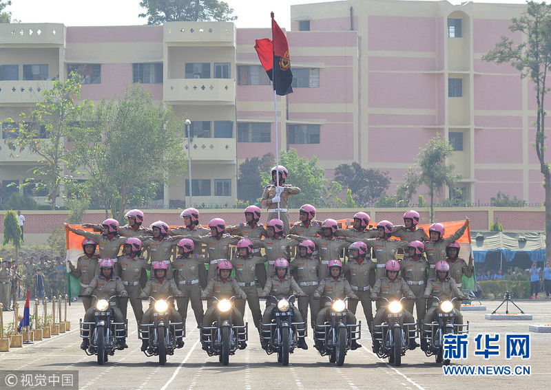 5月19日,印度卢迪亚纳,在Kharkan训练营,印度边防部队女警察展示摩托车特技。(图片来源:视觉中国)