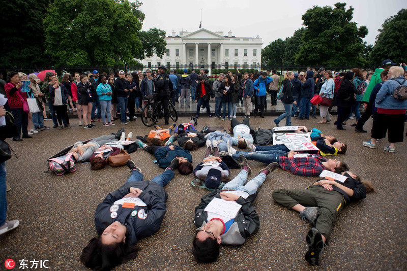 当地时间2018年5月19日,美国华盛顿,当地高中生在白宫前“躺尸”集会,纪念得州圣达菲高中枪击案的受害者,要求特朗普和国会通过控枪法案。