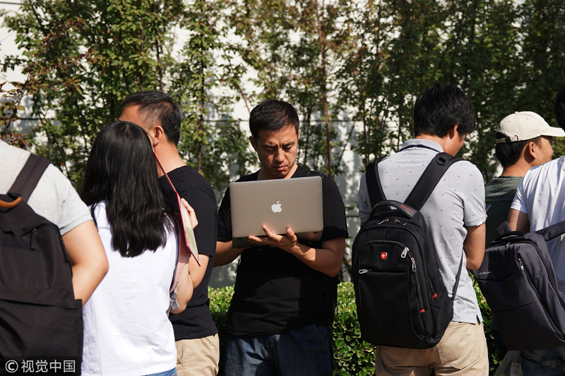 2018年5月19日,天津市河西区行政许可服务中心院外边用电脑边排队的年轻人。