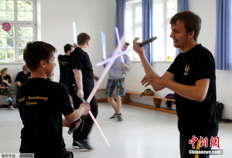 当地时间5月19日,德国Loibling,《星球大战》系列电影的爱好者在“绝地武士学院”上课。该学校是德国唯一一家注册的光剑格斗学校。