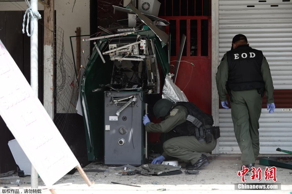 当地时间5月21日,泰国那拉提瓦巴卓区,泰国士兵检查一处发生爆炸的ATM机。泰国南部边境多地多处提款机发生连环爆炸,事故造成三人受伤。据泰国媒体报道,当地时间周日(20日)晚7点左右,泰国南部边境北大年府约四处地点发生爆炸,爆炸地点多数为银行ATM提款机。
