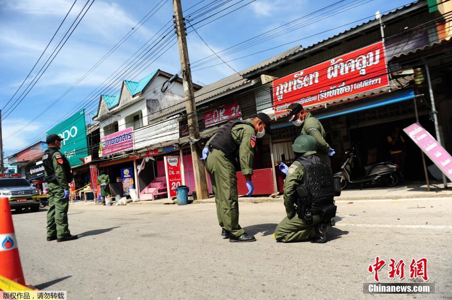 当地时间5月21日,泰国那拉提瓦巴卓区,泰国士兵检查一处发生爆炸的ATM机。泰国南部边境多地多处提款机发生连环爆炸,事故造成三人受伤。据泰国媒体报道,当地时间周日(20日)晚7点左右,泰国南部边境北大年府约四处地点发生爆炸,爆炸地点多数为银行ATM提款机。