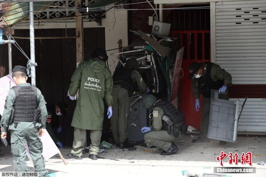 当地时间5月21日,泰国那拉提瓦巴卓区,泰国士兵检查一处发生爆炸的ATM机。泰国南部边境多地多处提款机发生连环爆炸,事故造成三人受伤。据泰国媒体报道,当地时间周日(20日)晚7点左右,泰国南部边境北大年府约四处地点发生爆炸,爆炸地点多数为银行ATM提款机。