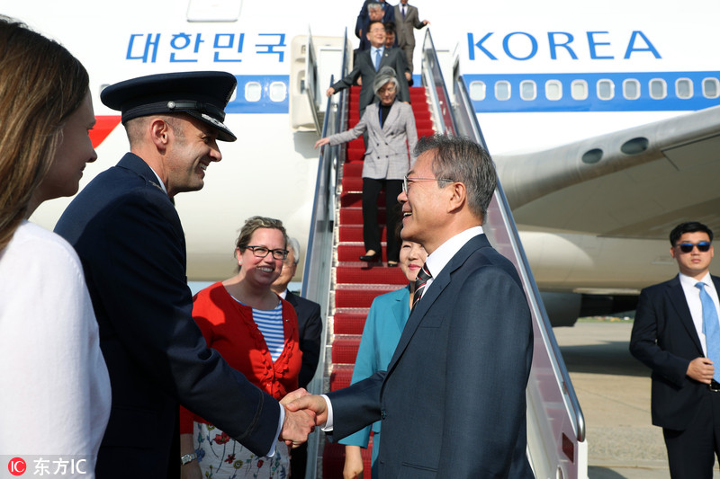 文在寅夫妇抵美访问 “第一夫人”下飞机小心翼翼