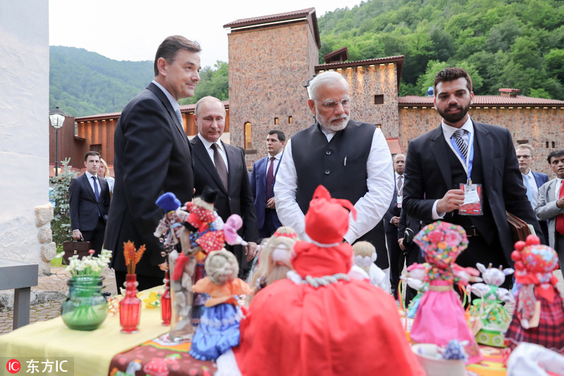 当地时间2018年5月21日,俄罗斯索契,俄罗斯总统普京与印度总理莫迪举行会晤,并一同参观“天狼星”教育中心。