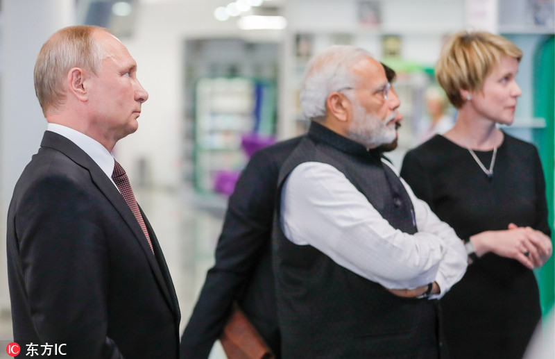 当地时间2018年5月21日,俄罗斯索契,俄罗斯总统普京与印度总理莫迪举行会晤,并一同参观“天狼星”教育中心。