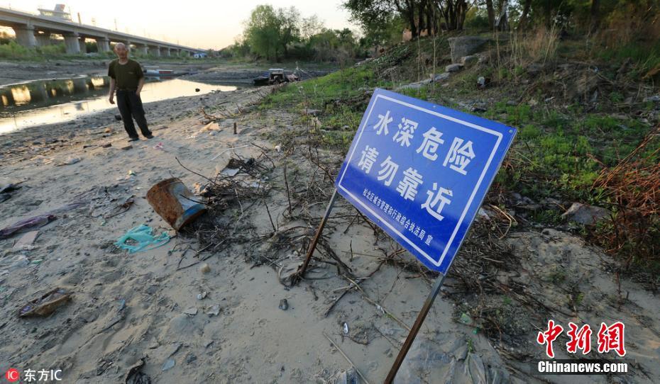 哈尔滨松花江现罕见低水位 渔船搁浅河蚌堆积