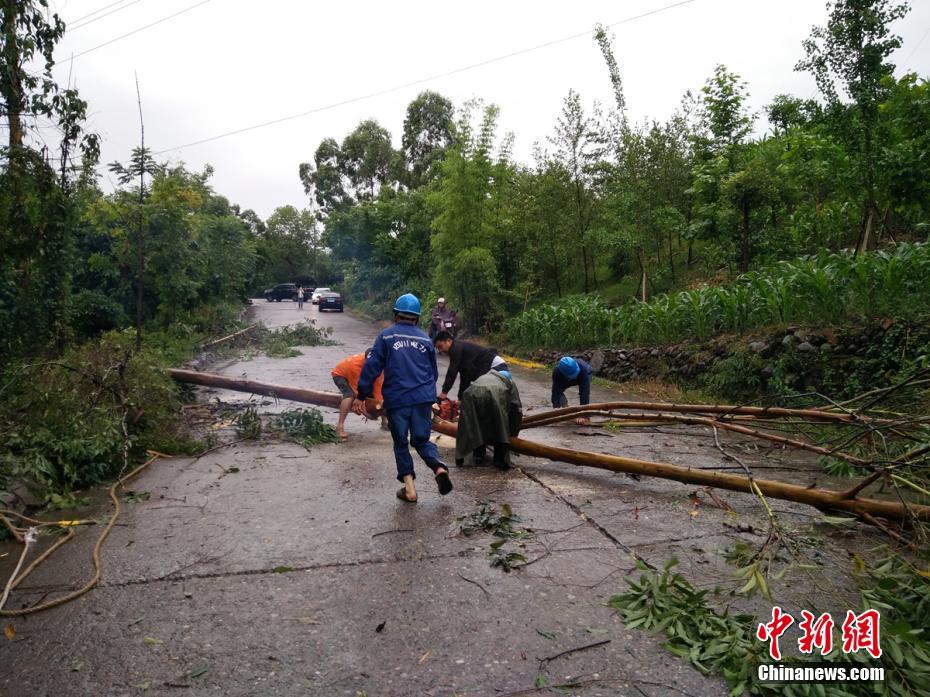 据了解,此次最大雨量出现在峨眉山市九里镇兴阳村,高达324.4毫米。大暴雨主要出现在峨眉、夹江、沙湾、沐川、五通桥和乐山市中区及犍为县等部分地方。图为电力抢修人员正在清障,全力恢复电网供电。  乐山交警供图