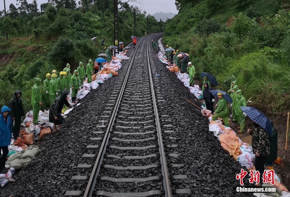 目前,乐山境内的降雨仍在持续,当地上千名救援抢险人员依然奋战在抗洪一线,开展排涝、排险、抢通道路和电力线路恢复等工作,相关灾情等当地政府相关部门正在核查中。图为暴雨致成昆铁路九里至轸溪区间发生泥石流灾害,抢险人员现场排险。 钟欣 摄