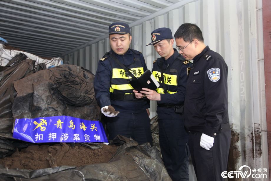 2018年5月22日, 青岛海关关员在对走私进口的固体废物进行查验取证。(张进刚  范昌辉 摄)