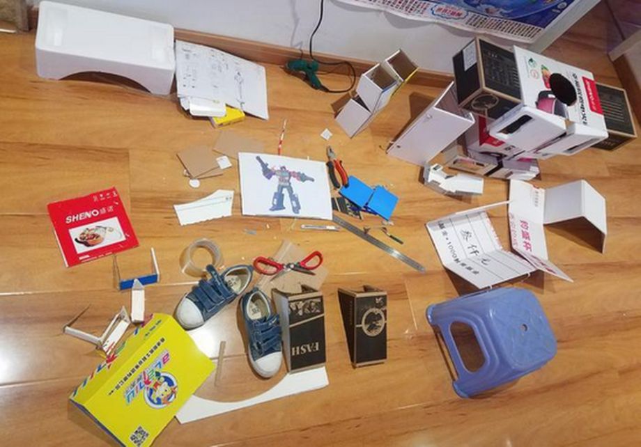 根据图纸,刘炜用了6个纸箱制作了大大小小上百个零部件,然后用了50多根热熔胶,将这些部件拼接在一起,做出擎天柱的大概外形,然后将彩色打印纸贴在外面进行美化。为了形象更加逼真,刘炜还专门用毛笔沾着打印机废弃油墨画出汽车人的机器质感。整个变形金刚高达一米五左右,重达10斤,分为头盔、上衣盔甲、下肢、鞋子、武器几部分,一共制作了十几天,每天都要近十个小时。 记者 翟小雪