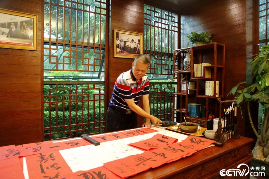 社区为居民专门布置有渔村学堂,室内设有茶艺、棋盘等文娱设施,桌上铺满了许多书法作品,一名村民正在练习毛笔字。
