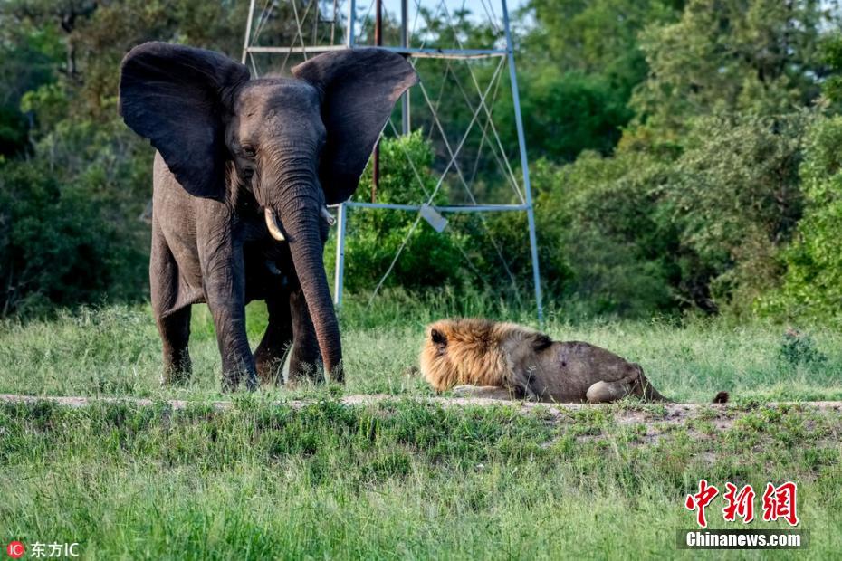 2018年5月23日消息,在南非克鲁格国家公园,摄影师Larry Pannell捕捉到一头年迈的狮子被大象驱赶的心酸画面。图片来源:东方IC 版权作品 请勿转载