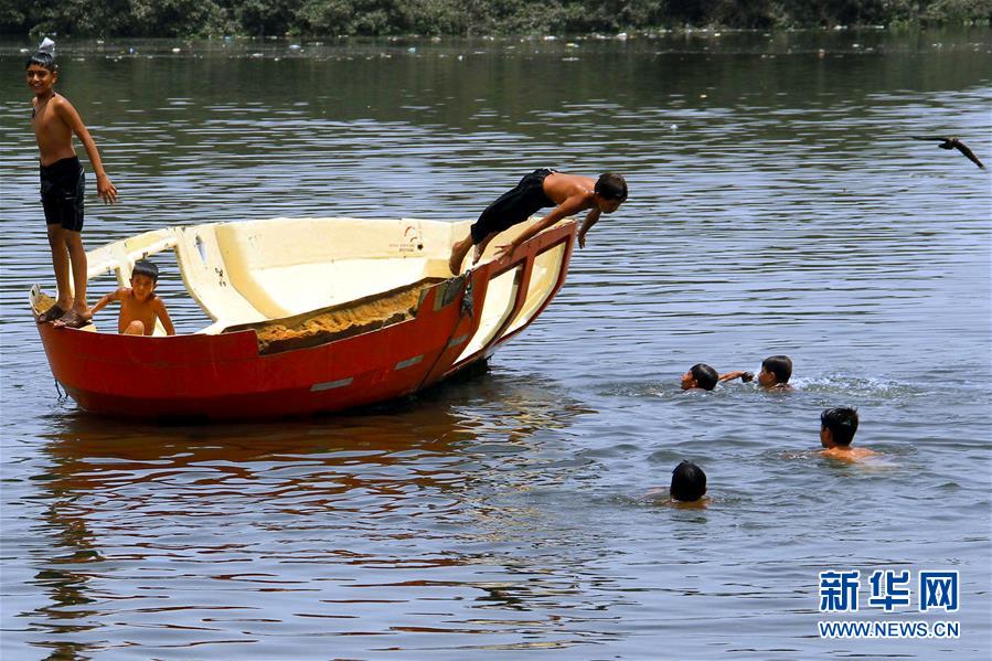 5月22日,在巴基斯坦卡拉奇,男孩们跳进水中消暑。近日,巴基斯坦南部城市卡拉奇连遇高温天气,最高气温达44摄氏度,已造成至少65人死亡。新华社发