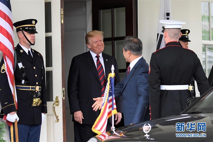 5月22日,美国总统特朗普(左二)在华盛顿白宫欢迎到访的韩国总统文在寅(左三)。新华社记者杨承霖摄​