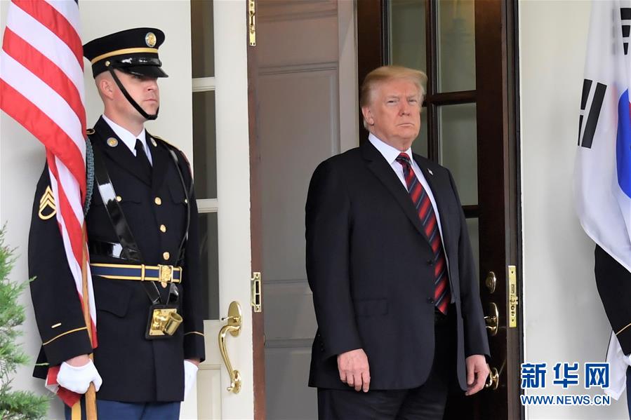 5月22日,美国总统特朗普(右)在华盛顿白宫等候到访的韩国总统文在寅。新华社记者杨承霖摄