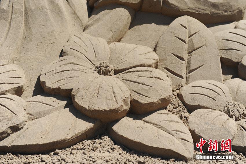 地处中俄朝三国交界的吉林珲春,近期正在打造一系列沙雕艺术品。据了解,这些沙雕作品包括《喀秋莎》《怒放的金达莱》《吴大澂》等,充分展示了中俄朝三国的特色历史文化。沙雕师们利用图们江丰富的泥沙资源,就地取材,经过压制、雕塑、涂胶等步骤,将沙雕形象惟妙惟肖地呈现出来。历时一个多月时间,已经完成12座沙雕艺术品的制作。图为沙雕的细节非常逼真。 刘栋 摄