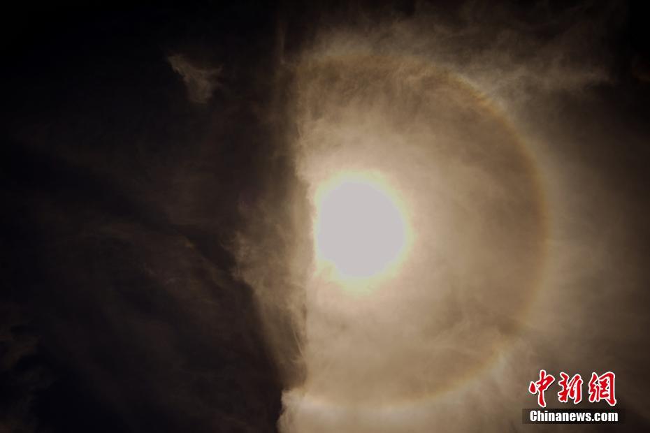 5月23日中午11时许,西藏自治区拉萨市区天空出现日晕奇观,中新网记者观察发现,此次日晕持续了约5个小时,到16时许才逐渐消失。日晕出现期间大部分时段光环显著,非常美丽、壮观。日晕又叫圆虹,是一种大气光学现象,系日光通过卷层云时,受到冰晶的折射或反射而形成的。当日,不少拉萨民众拿出手机对着天空拍照,纷纷在微信“朋友圈”晒出自己拍摄的日晕美图。图为拉萨宗角禄康公园内格桑花雕塑和天空中的日晕。 江飞波 摄