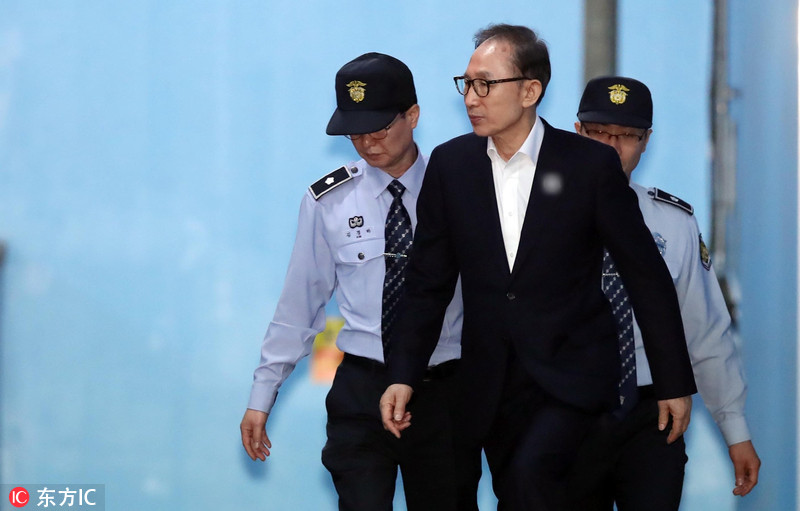 当地时间2018年5月23日,韩国首尔,涉贿被捕的韩国前总统李明博结束首次庭审后,离开首尔中央地方法院。据韩媒报道,77岁的李明博遭到16项指控,包括涉嫌受贿111亿韩元及贪污349亿韩元等。