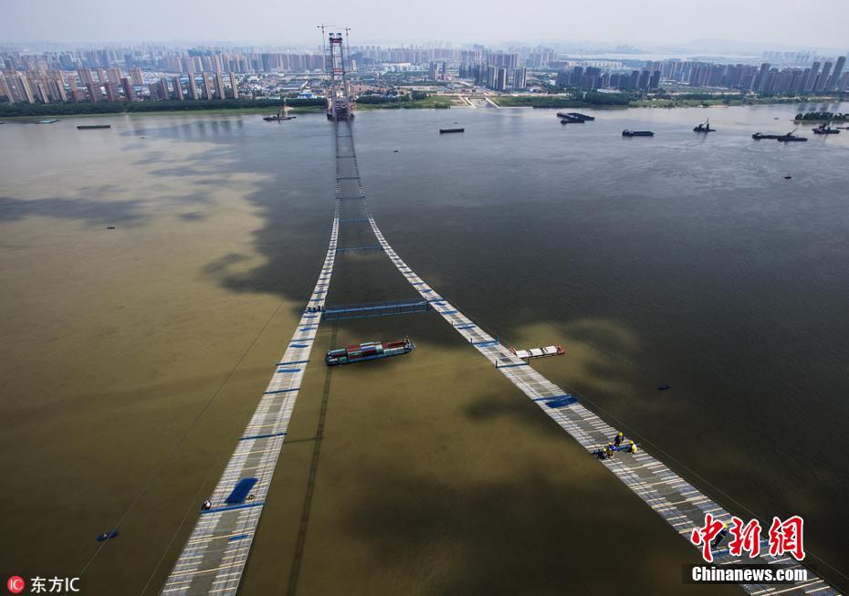 5月14日11时许,记者在228.8米高空建设现场感受到,高空风力在6级上下,中跨、边跨施工便道现场一片忙碌景象:班组长雷承易带着10余名工人或在用扳手锚紧猫道面网的扶手绳,或在铺设铁丝防护网…… 图片来源:东方IC 版权作品 请勿转载