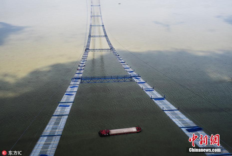 猫道是悬索桥施工时架设在主缆之下、平行于主缆的线形临时施工便道,是主缆系统乃至悬索桥整个上部结构的施工高空脚手架平台,作为极其重要的临时施工设施,大桥竣工后被拆除。据了解,杨泗港长江大桥总长约4.1公里,是世界上跨度最大的双层悬索桥,大桥预计在2019年建成通车,通车后将完善武汉城市快速路骨架系统,缓解过江交通压力。 图片来源:东方IC 版权作品 请勿转载