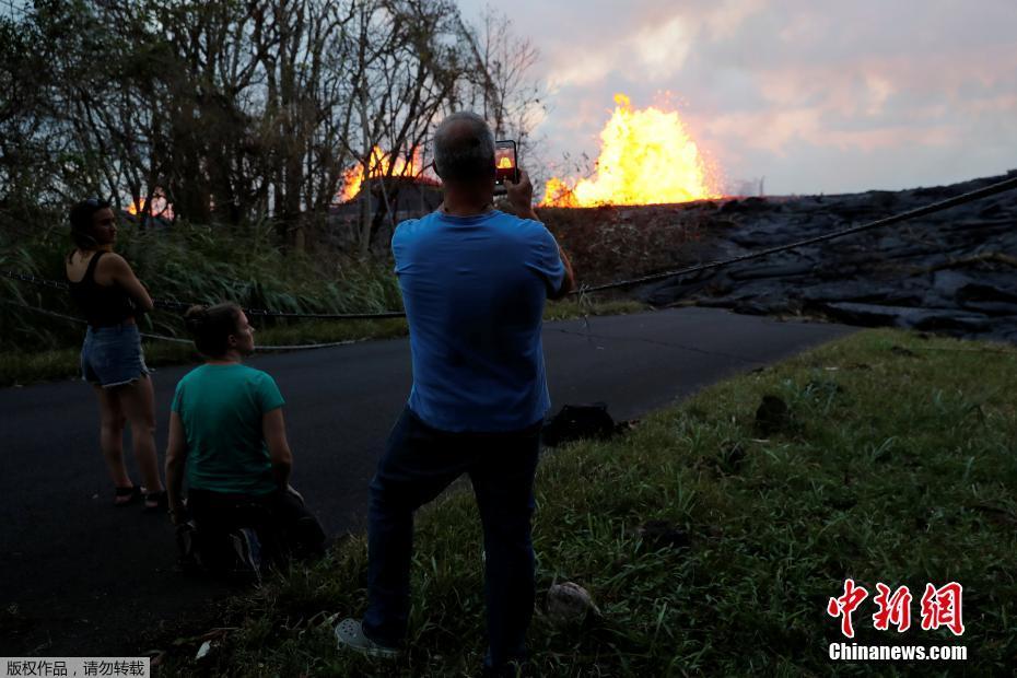 当地时间5月23日,夏威夷基拉韦厄火山已持续喷发十余天,夏威夷大岛当地出现超过20条熔裂缝,岩浆不断喷涌。火山喷发已经造成夏威夷当地50栋建筑被毁。图为民众在不远处围观岩浆喷涌。