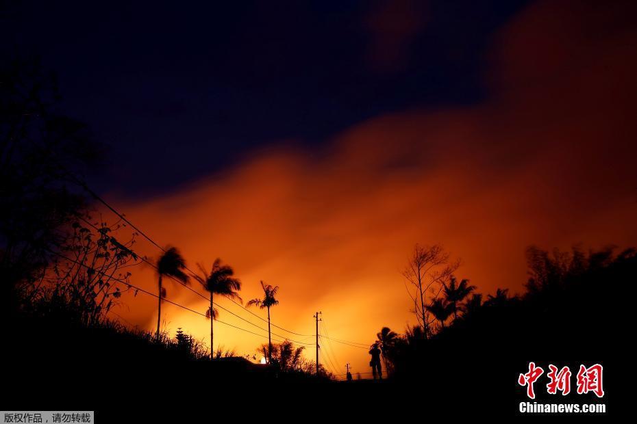 当地时间5月23日,夏威夷基拉韦厄火山已持续喷发十余天,夏威夷大岛当地出现超过20条熔裂缝,岩浆不断喷涌。火山喷发已经造成夏威夷当地50栋建筑被毁。图为岩浆映红夜空。
