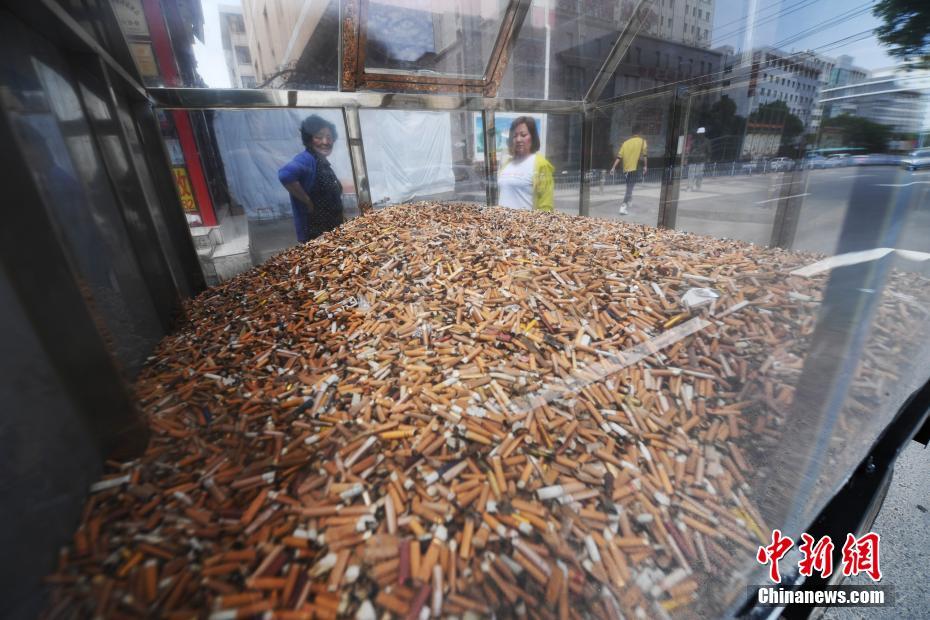 5月24日,兰州市城关区收集的上万个被乱扔的烟头在街头展出,引发民众关注。近日,兰州市城关区雁滩环卫市政管理所将环卫工捡拾的上万个被路人乱扔的烟头,摆上街头展出,倡导民众体谅环卫工人辛苦,别让烟头随意落地。 中新社记者 杨艳敏 摄