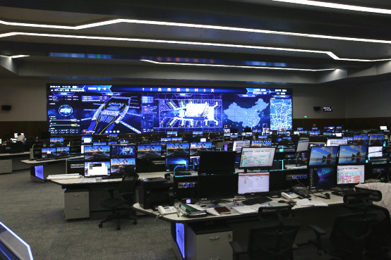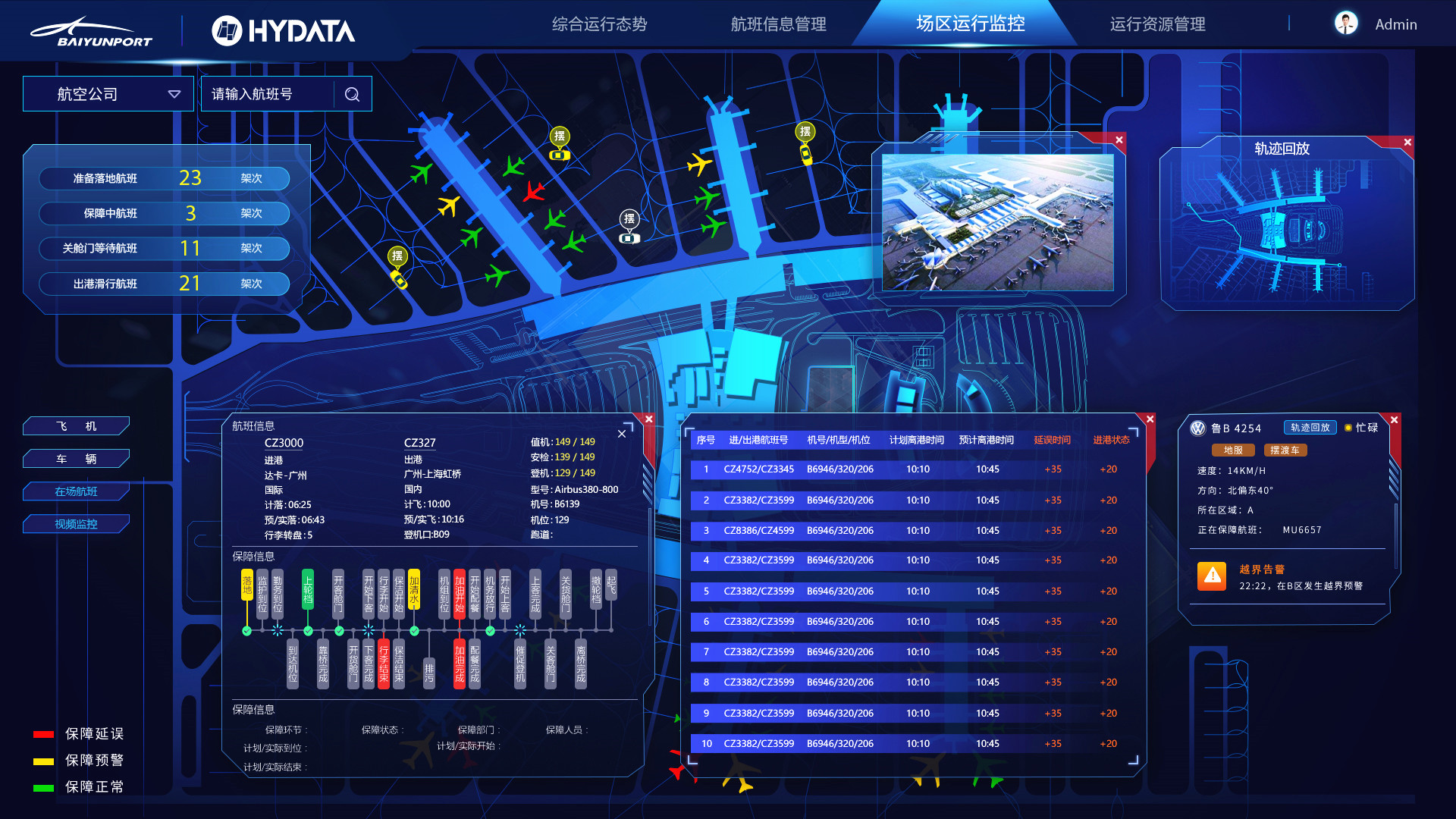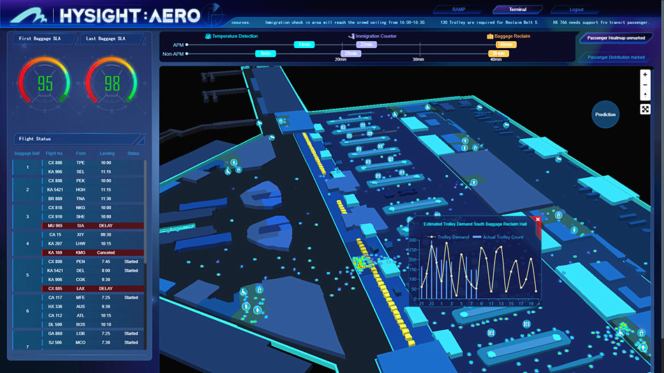 广州白云机场的可视化智能指挥决策系统,对机场内“三大区”(即飞行区、航站区、综合区)的各项业务数据进行整合,集合空管、气象、交通、地图、运营商等数据,结合大数据可视分析技术与人工智能技术,实现了对 “五大流”(即飞机流、旅客流、行李流、货物流、交通流)全区域覆盖、全流程管控,每分钟可处理6万条信息。通过分析出机场当前的综合运行态势、各场区运行动态,对机场整体态势进行实时可视化展现,实现通过“一张屏”了解机场整体运行状况和进行各种调度。