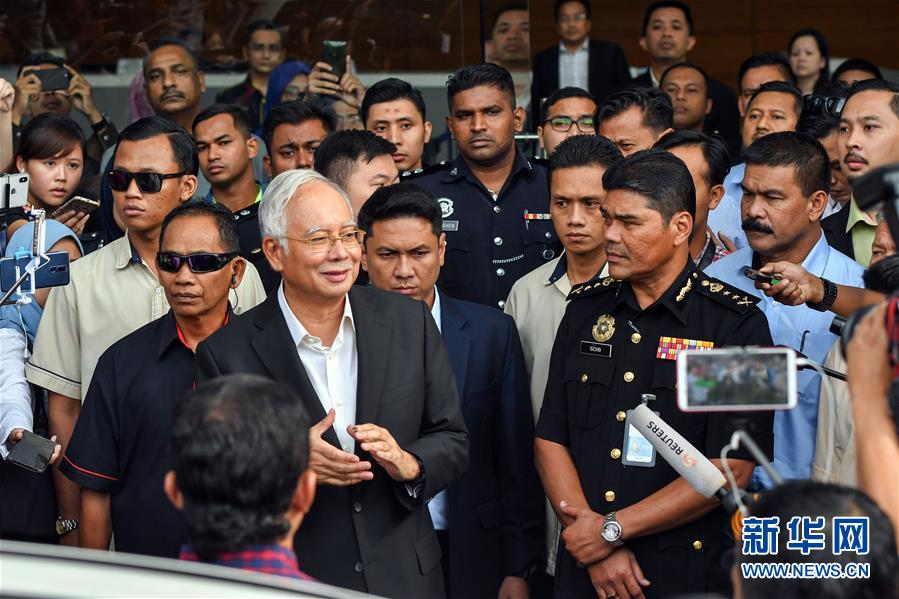 5月24日,在马来西亚普特拉贾亚,马来西亚前总理纳吉布(前左)接受问话后离开反腐败委员会。新华社发(张纹综摄)