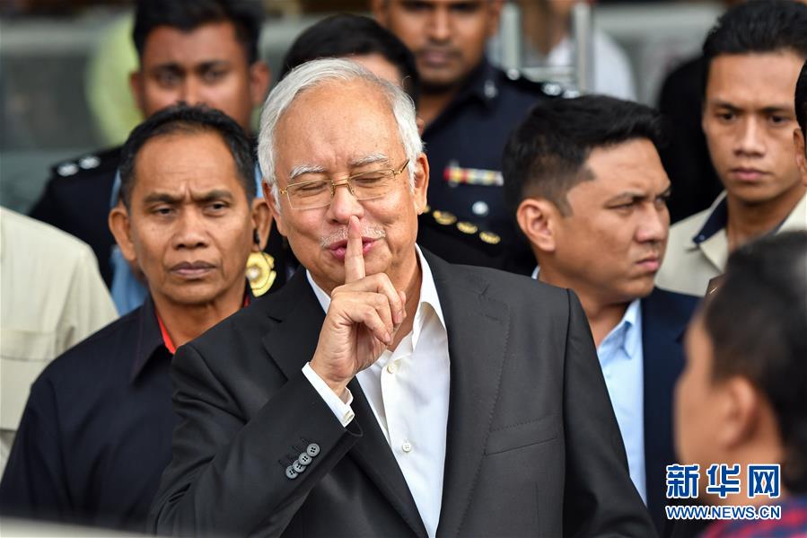 5月24日,在马来西亚普特拉贾亚,马来西亚前总理纳吉布(前)接受问话后离开反腐败委员会。马来西亚前总理纳吉布24日到位于普特拉贾亚的马反腐败委员会,第二次接受关于“一个马来西亚发展公司”的调查问话,问话持续近7小时。新华社发(张纹综摄)