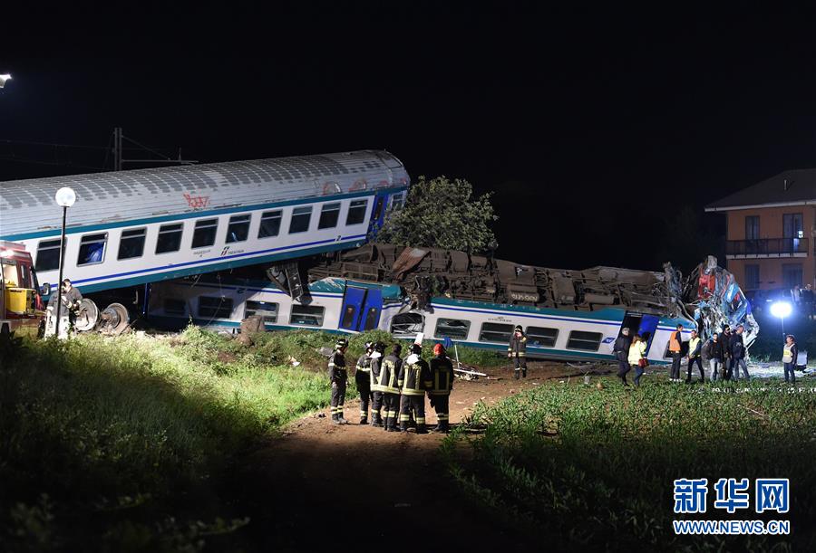 这是5月24日在意大利西北部皮埃蒙特地区拍摄的事故现场。据意大利消防部门24日公布的信息,23日晚发生在意大利西北部皮埃蒙特地区的火车与货车相撞事故,至少造成2人死亡、23人受伤。新华社发